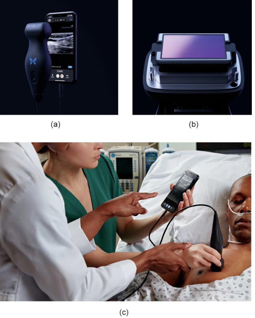 圖.(a)Butterfly Network公司的iQ+超聲系統為有線手持設備,即通過數據線與手機連接。(b)設備的一端包含産生超聲波的矽芯片,其中9000個微型傳感器組成了一個二維陣列(移除探測器頂部外殼後可見)。該技術使得設備在同一端可進行線性和弧形探測。(c)外科醫生使用iQ+對患者進行檢測。來源:Butterfly Network公司授權。